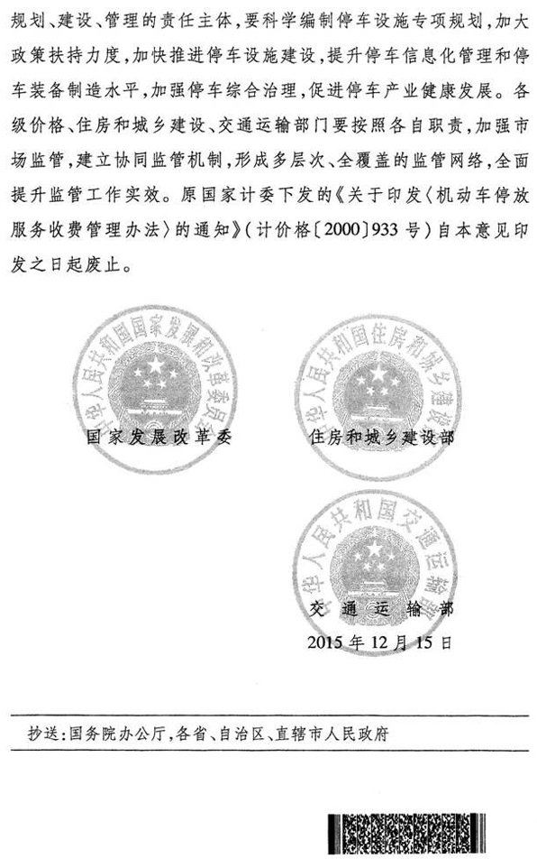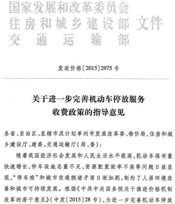 附件:1.國家發(fā)展和改革委員會 住房和城鄉(xiāng)建設(shè)部 交通運(yùn)輸部關(guān)于進(jìn)一步完善機(jī)動車停放服務(wù)收費(fèi)政策的指導(dǎo)意見(發(fā)改價格〔2015〕2975號)