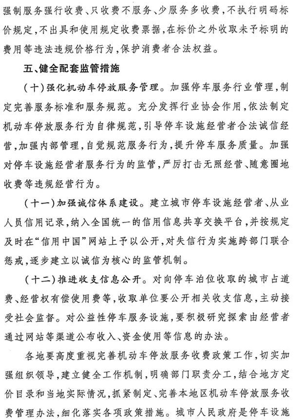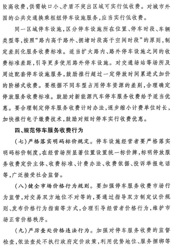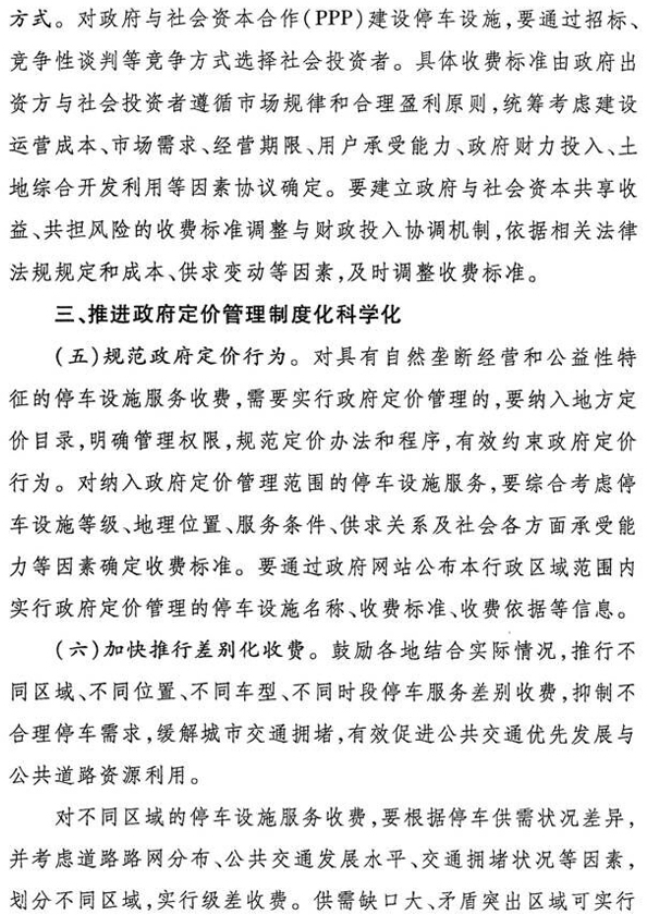 一、合理界定政府定價范圍,科學(xué)制定收費(fèi)辦法和收費(fèi)標(biāo)準(zhǔn)。設(shè)區(qū)的市要根據(jù)當(dāng)?shù)赝\噲鼋ㄔO(shè)、道路擁堵等實(shí)際情況,按照投資資金來源、社會公益性質(zhì)、自然壟斷性質(zhì)等合理界定政府管理價格的停車場范圍,盡快制定完善本市機(jī)動車停放服務(wù)收費(fèi)管理辦法。對實(shí)行政府定價的停車場,要根據(jù)建設(shè)成本、供求狀況、交通擁堵、經(jīng)濟(jì)社會承受能力等因素,科學(xué)制定收費(fèi)標(biāo)準(zhǔn),落實(shí)差別化收費(fèi)政策,合理疏導(dǎo)停車供求矛盾。