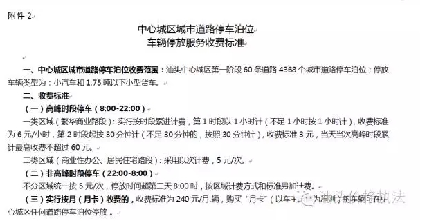 (二)路內(nèi)的人工停車場和自動收費(fèi)停車設(shè)施機(jī)動車停放保管服務(wù)收費(fèi)。中心城區(qū)城市道路停車泊位依照《汕頭市城市道路停車泊位管理規(guī)定》(汕頭市人民政府令第103號)施劃,計(jì)費(fèi)方式和收費(fèi)標(biāo)準(zhǔn)按附件2執(zhí)行。
