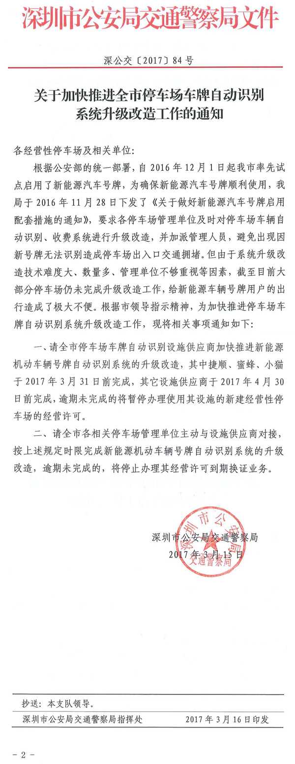 【廣東省深圳市】關(guān)于加快推進(jìn)全市停車場車牌自動識別系統(tǒng)升級改造工作的通知(深公交[2017]84號)