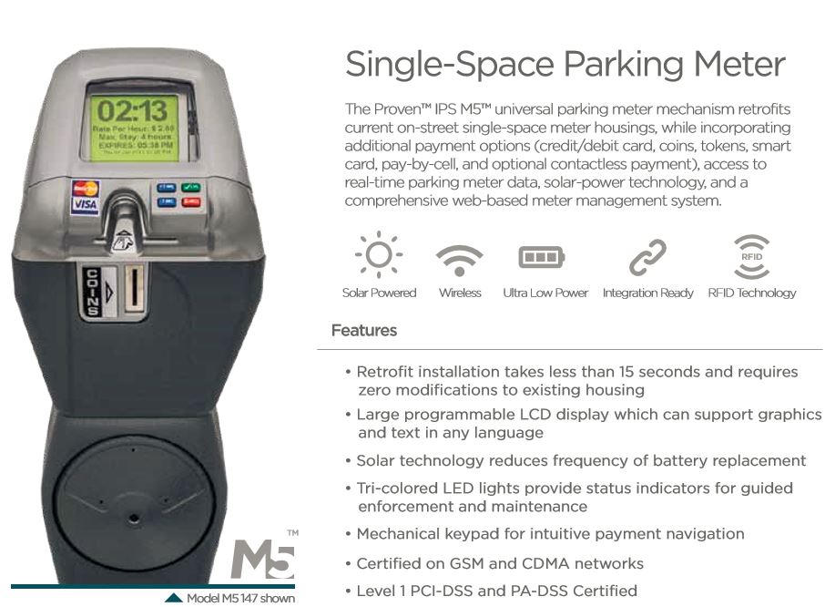 在世界各地的街道上,你會發(fā)現(xiàn)處于各個技術(shù)階段的停車咪表。世界上第一臺咪表是1928年的專利發(fā)明,最初需要由停在車位上的汽車電池供電;發(fā)展到今天,出現(xiàn)了太陽能停車咪表,可接受各種支付方式。下圖就是最新的一款停車咪表: