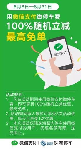 8月8日起,在珠海路邊停車(chē)通過(guò)微信支付繳停車(chē)費(fèi)的車(chē)主們可以享受隨機(jī)立減優(yōu)惠啦,最高可免單。
