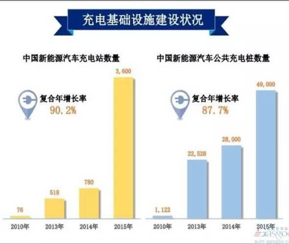 我國(guó)充電基礎(chǔ)設(shè)施逐漸完善,新能源汽車充電站的數(shù)量從2010年的76個(gè)到2015年的3600個(gè),復(fù)合年增長(zhǎng)率為90.2%。新能源汽車公共充電樁的數(shù)量從2010年的1122個(gè)到2015年的49000個(gè),復(fù)合增長(zhǎng)率是87.7%。