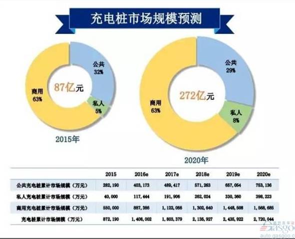 據(jù)圖表顯示,我國(guó)重視充電樁市場(chǎng)的投資,在2015年,投入約87億元,而在2020年,預(yù)計(jì)投入272億元,這預(yù)示著充電樁市場(chǎng)規(guī)模還有很多未知的發(fā)展空間。